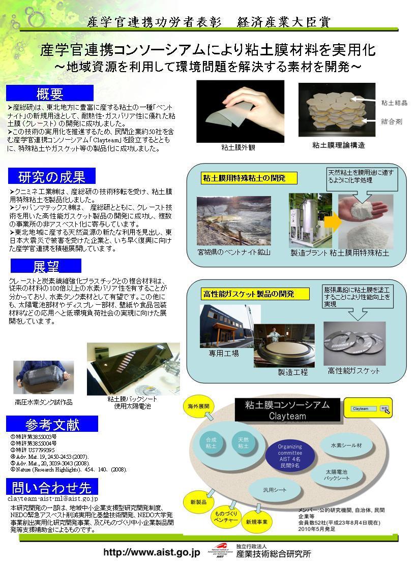 一般社団法人Clayteamメンバーの研究成果が、第10回産学官連携推進会議で「経済産業大臣賞」を受賞しました!! 「産学官連携功労者表彰」とは、大学、公的研究機関、企業等の産学官連携活動において、大きな成果を収め、また、先導的な取り組みを行う等、産学官連携の推進に多大な貢献をした優れた成功事例に関し、その功績を称える事により、日本の産学官連携の更なる進展に寄与することを目的としています。 表彰式は、2011年9月22日(木)に東京国際フォーラムで行われます。 | ||